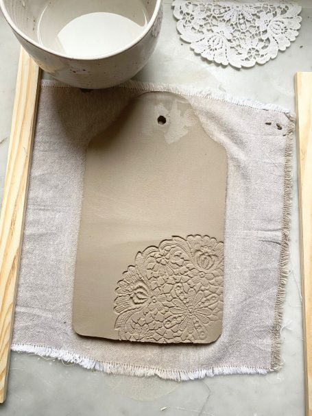 Wir beginnen damit, den Ton auszurollen und zu bearbeiten. Wir streifen ihn schön glatt und schneiden den Ton in Form. Dann verzieren wir das Brettchen noch mit verschiedenen natürlichen Strukturen aus Steinen, Blumen und Stoffen und glätten die Kanten.